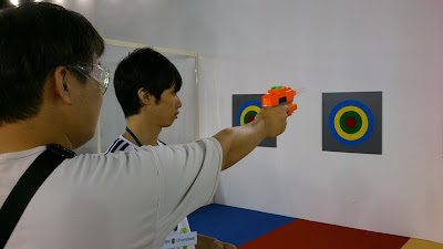 籃球區 - 這關需要有Android手機,現場也提供出借,開始前要先下載Goggles,進場後用這個App對著場上立牌的籃球明星掃瞄,並找到網路上的資訊,之後開始投籃,一樣是投三顆,這個框有比標準框來得高些,前面兩球沒進,第三球調整用跳投方式,有投進,即完成此關任務.